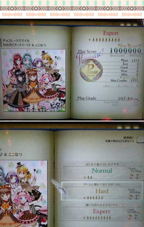 チョコレートスマイルExpertです(。・ω・)ゞ 無事「Pianist」達成出来ました.+:。 ヾ(◎´∀`◎)ノ 。:+. そして「Pianist tower」完成しました(*ノ゚Д゚)八(*゚Д゚*)八(゚Д゚*)ノィェーィ! 今日は、ひなビタ♪のアルバムを聴いていてチョコスマを終わらせてないなぁ~と思い実行しました⋅⋅⋅無事完遂出来て満足ッス*。・+(人*´∀`)+・。* でわ、お疲れ様でした|д゚)ノ