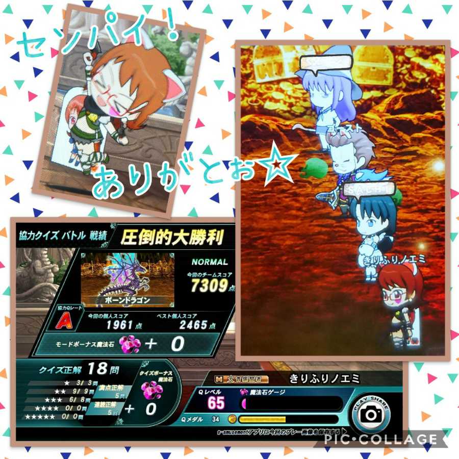 【妄想小劇場:特訓するアイコ編】 自分「時報も終わって投票も済んで、夜QMAのお時間ですよ!」 ミュー「今日のテーマは『アイコさん補習計画』です」 アイコ「な、なんでー!?Σ( ̄□ ̄;) 追試受かったじゃんっ!?」 メディア「アイコちゃん、レベルを見てみて☆」 アイコ「64…だけど…」 自分「なので、65まで上がって頂きます!」 アイコ「ふぇぇっ!?」 メディア「ほら、最近私たちが入って出番が減ってたでしょ?」 ヴァネッサ「ですから、ここで稼いで頂きたいと思いまして…」 アイコ「もーそんな事いいのに~…」 自分「ということで早速開始です!」 アイコ「みんなありがとねっ!頑張ってくるよ!(*≧▽≦)ノ」 自分「と、意気揚々と入ってはみましたが…」 アイコ「時報との温度差が凄いよね><」 自分「初心者が多いNORMALだし、スタンプまで気は回らないよ^-^;」 アイコ「それもそっかぁ~」 自分「こちらが引っ張ってあげないとね」 アイコ「レベル1ケタっていう人ばっかりだもんね!」 アイコ「快勝快勝!よっしゃよっしゃ~♪(*≧▽≦)ノ」 自分「時報から引き続き良い流れで勝てているね」 アイコ「よぉ~し、次いってみよぉ~!」 ――その時、背筋を這い上がるざわめきに似た感覚が アイコ「っ!?」 自分「この感覚は…まさか…っ!」 ――重装備の騎士が狐火を伴って現れた アイコ「で、でたーーーっ!」 自分「幽霊騎士様だッ!!」 アイコ「これ絶対勝ったフラグじゃんっ!(*≧▽≦)ノ」 自分「逆に言えば、下手な試合は出来ないって事だけどね…」 アイコ「うっ、確かにそーともいう…」 * * * 自分「結果、危なげなく圧勝頂きました!」 アイコ「だから言ったじゃん♪」 自分「この調子でガンガン行こうか!」 アイコ「おーーっ!(*≧▽≦)ノ」 ――ぱぱらぱっぱぱー☆ アイコ「やったーーっ!♪」 自分「おぉっ、おめでとう!」 アイコ「ありがとぉ☆(*≧▽≦)人(´▽`*)」 自分「皆様に遅れること(ピー)か月、やっと65だね」 アイコ「そんなのカンケーないよ」 自分「ほ?」 アイコ「だってペースなんて人それぞれだもん、競ってるわけでもないし!」 自分「確かにそうだ、これからも気長にやっていこうか」 アイコ「そだねっ☆」 自分「ということで、ゴースト様ことダークグレイ様と 何と4戦マッチさせて頂きました!」 アイコ「センパイ、ホントにありがとぉ!(*≧▽≦)ノ」 ミュー「うらやましいのです~」 ヴァネッサ「回答速度もさることながら、スタンプ捌きも流石でした♪」 メディア「本当に楽しかったわ☆」 自分「本当にありがとうございました!」