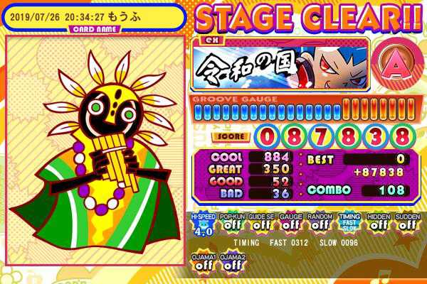 初見。 火風陸空以上ヒプロ3未満。 ゲージが辛くない代わりに配置はヒプロ3より押しづらいと思った。 あと譜面がズレズレで全然光らん