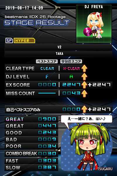 お久しぶりです(*゚∀゚)ゞ どれくらいお久しぶりかと言うと3ヶ月ぶり位ですかね? …(;゚∇゚) 仕事とプライベートで弐寺やりたくても時間が作れず、できたとしても成果は皆無で投稿するリザルトが一切なかったです(ToT) やっぱり弐寺は持続してやることが大切だと痛感しています… 現状ですが、プライベートは落ち着きましたが、仕事の部署が変わった影響で弐寺の時間は前ほどつくれそうにないかもしれないです。 なので、今ライバル登録して頂いている方でアクティブなライバルじゃないと難しいという方は変えて頂いた方がいいかもしれないです。 自分は変わらずライバル登録しておきますので、これからもスコアやクリアの目標にさせて頂きます(^3^)/ リザルトは今作初プレーで久々に☆10難点いたのでアップしときました!
