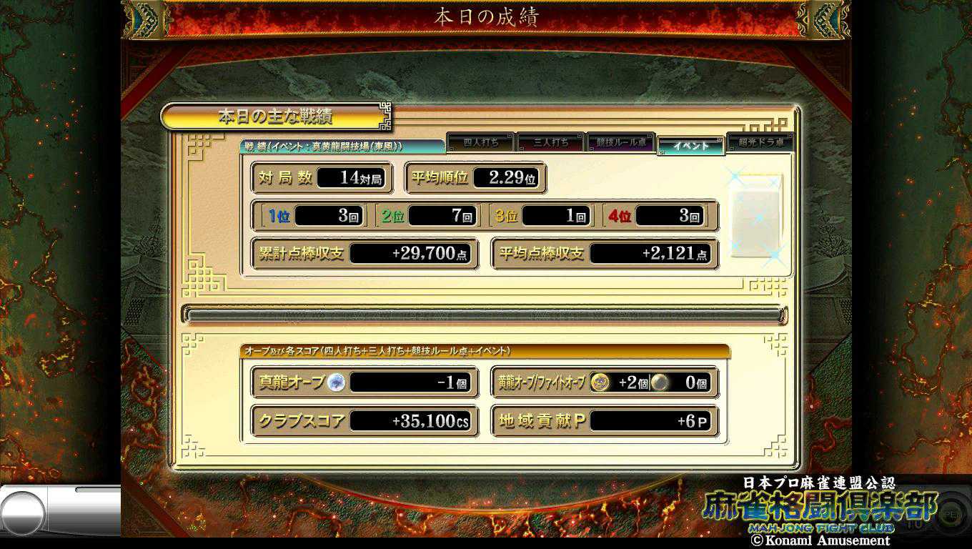 真龍復帰して初めての蛟龍になったけど昨日ドラ卓やってたから当然ですね。成績は真龍オーブマイナスだから負けかな。