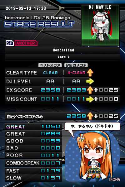 Weekly。乱でもやってみたけど正規のが高かったのでそのまま。そろそろ「スコアを出すために乱かけよう」って意識になれたら良いんだけどなぁ。 あと今日はすんごい上手い方が隣でやられていたので、参考になる部分がちらほらあったのが嬉しい。