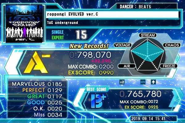 「roppongi EVOLVED ver.C」SP激 スコア更新。 A- 乗ったよ。 自分でやっておきながら、FLATで譜面がよくわからないや。