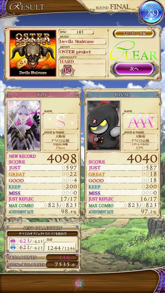 旧Lv10最初のクリアの曲にして、リフレクの高難易度挑戦のきっかけとなった曲。ようやく形にできた。 Devilz Staircase(赤) ALL JUST REFLEC フルコンボ S 98.4%