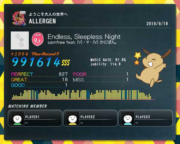 大会宣伝その3 Endless Sleepless Night 990k乗っけて来ました。この譜面、配置の問題なのかやたらにミスタッチするんですよねFCが取れない(ヽ´ω`)