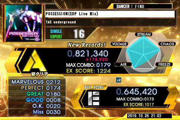 今日のDDR、FINDの速報。 『POSSESSION(EDP Live Mix)』SP-EXPERT。 やった……新規SPレベル16のクリア、達成しました!!