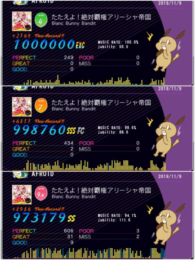 アリーシャ三色。 ツァーリと言ってますが硝煙より「けものつかい」臭が強いです。 緑 二度目でEXC(*´ο`*)=3 序盤の低速がポイントでした。 黄 三度目でフルコン。 序盤の①④⑨⑫のHOLDの調子が悪かったですorz ライバル全員2グレスコアでしたw 赤 ☆無☆理☆ やればやるほど減りますね。 体感9.7〜9.8です。 次回のロカマチで飛んで来る奴やで←