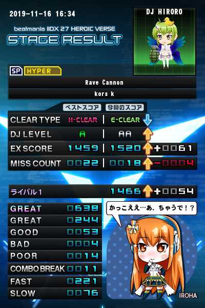 SP☆9 Rave Cannon(H) イチオシでプレイしたスコアにLOTさんからプレゼントがあったので再度やりました(*^^*) (速報が入る→選曲画面でスコアが負けてるのを確認→挑戦状フォルダから選曲という流れでした) 最初は黄色いゲージでやりましたが、速い連皿で減らされて最後まで耐えられなかったので、通してやりました。 AAに乗ったし、返品成功です(/^^)/⌒●~* いつかEXHつけたいですね…