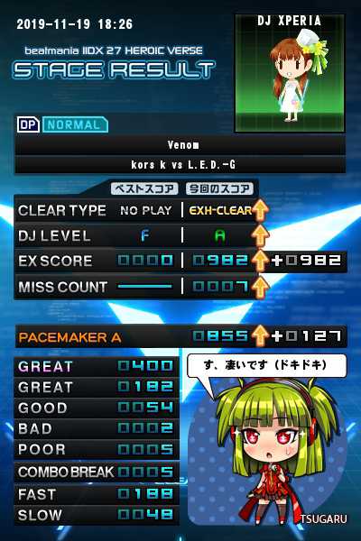 Venom DPN-Lv.7 EX-HARDクリア ここからはSINOBUZフォルダDPNのLv.7クリア埋めになるかもです。 先ほどのUsual Days-remixで、キャノボフォルダDPNのLv.7はひとまず全曲HARD以上クリアで揃いました。 通常(ゲージ)クリアが混じってないのでまだいいんですが、エメラルダスだけミスカウント26でHARDクリアのまま(他はEX-HARD以上でクリア済み)なのがどうも気がかりです。 確かにクリアレート75%ないので納得できなくもないけど、粘着は……… キャノボフォルダDPNのLv.6以下を埋めてみて、全体的にEXH以上で揃ったら粘着もアリ、もしHARDクリア止まりがあったら深追いしないという方向で判断しようかと思います。