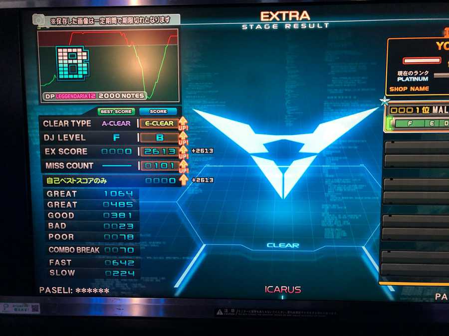 あと二つ…なんと、どちらも12.7のイージーランプなのです! 覚悟の準備をしておいてください。(ワザップジョルノ) イカロスDPLイージー!!!!!! 12.7初イージーはカマイタチ†とばかり思っていたので、まさかのイカロス†でびっくりでしたし、12.7初だったので感慨深いものがありましたね…やったぜ。成し遂げたぜ。 一応ノマゲまではあの加速超発狂を耐える必要は全くなくて、後半だけでクリアが可能です。 ただし…許容ミスはあまり許されず、ほぼ繋ぐくらいの力が必要となります。 発狂を耐える必要は無くても、そこそこ難しい譜面を繋ぐ力が求められるし、そこが12.7に値するのだと思いますね。