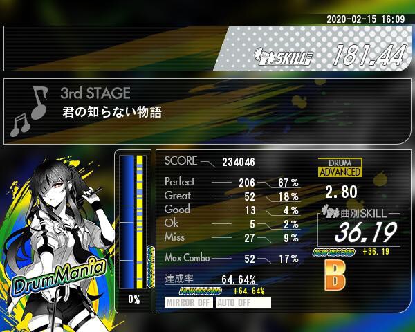 スマホやps4の音ゲーは経験者ですが、アーケードは初めてやりました!( ˙︶˙ ) ドラム楽しい!指だけじゃなくて全身使ってるのがよい〜🙆🏻♀️ プレイ初日の8曲目で「君の知らない物語(ADV)」挑戦したのですが普通にボロボロでした(笑) 叩けるようになったらもっと楽しいんだろうな〜明日もやろうかな、!