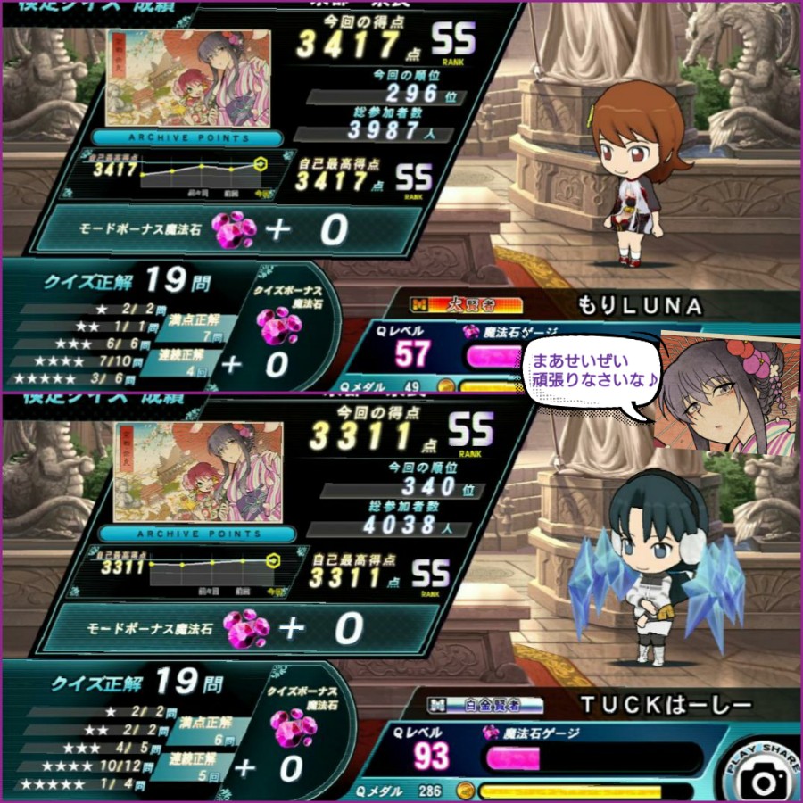 アイマヤコンビの京都・奈良検定チャレンジ。 あともうちょいでSSS行けそうな所まで持ってきたけど 何とももどかしいねこういうの(;´д`) ひと足お先にSSS乗っけたマラリヤさんからも 「まあ、せいぜい頑張ることね…ふふ。」 と慰められる始末… まあそのうち到達はするだろうから 気長にやり続けようとは思いますがf(^_^;)