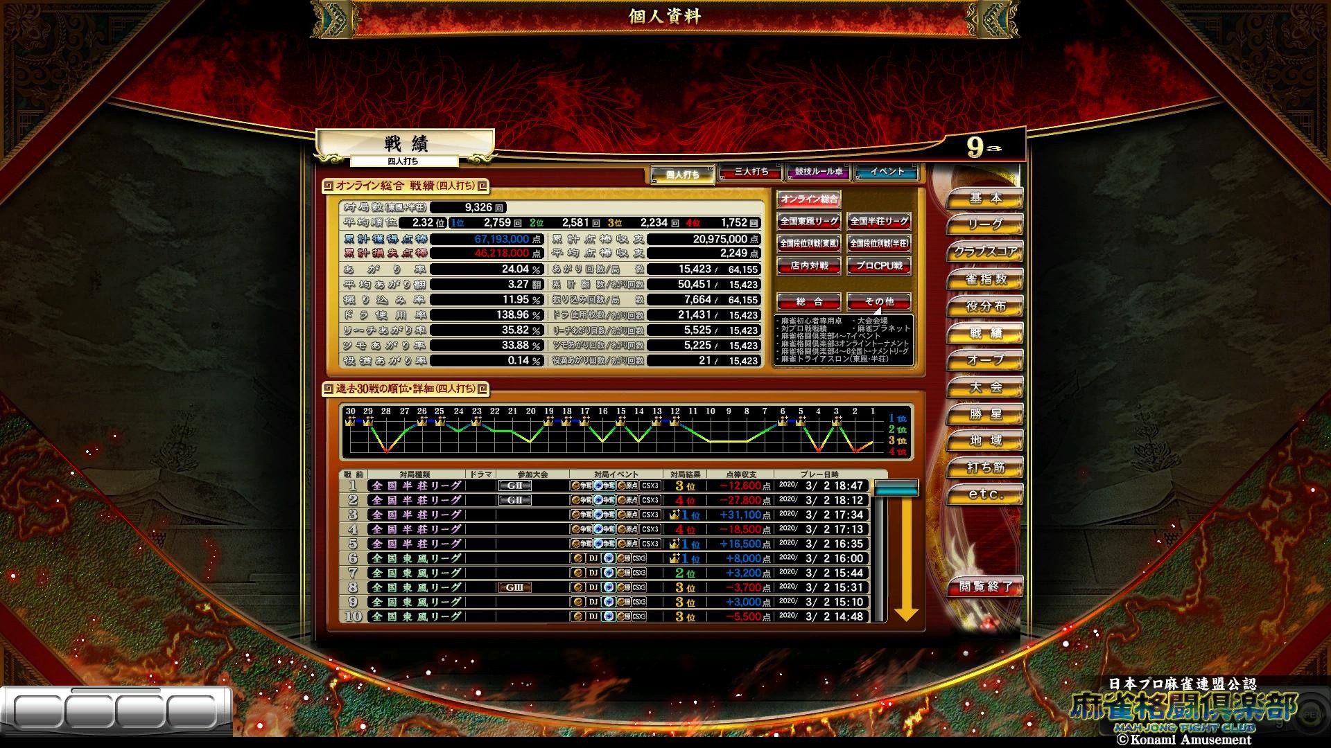 東風20対局、感触は良かったのですが その後半荘の2ラス(真龍珠4ロスト)が非常に内容悪かった。 特に動画配信をしているプレイヤーとの対局が4万点持ちから3局連続しての失態。 全国に醜態を晒す事になるのではないか…? 半荘の打ち方を大きく見直さなければならないと強く危機感を感じた今季初日でした…