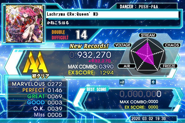 Lachryma《Re:Queen' M》[DP赤]初見、後半の捻り渡りどこで切り替えたら良いのか分からない…。譜面が要所要所やり辛いから16分無くても体感足15はある気がする。