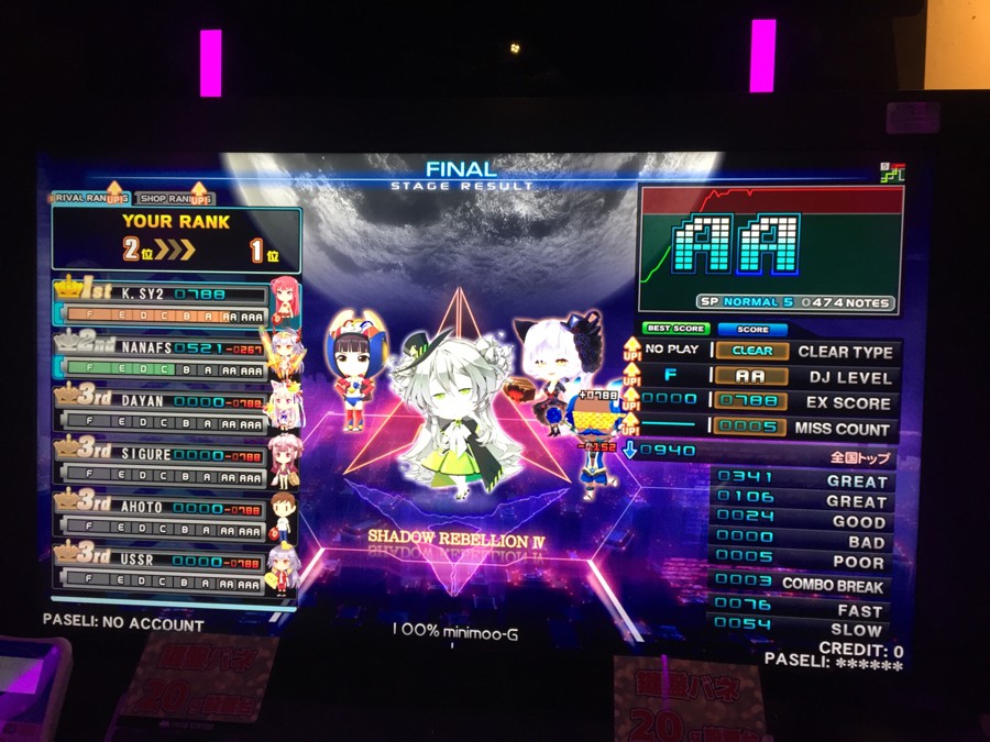 2020/03/24 撮影 100% minimoo-G(SPN☆5)+ニャミ(2P)サイド 初見ノマゲ。やったことなかったからRANDOM装備でAAランク。譜面により、メロディパートとリズムパートが変わってくる。