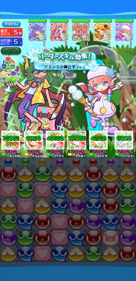 ローゼマの挑戦状より。相変わらずのステージ効果破壊スタイルです。敵の緑以外の反射は基本的に本来受けるはずのダメージの2倍になるようで、単発1連鎖目に黄色4つだけで消したりして火力を減らすようにすれば耐えることは可能です(これでも被ダメは13kと大きいがサタンのHPは19kあるため、死な安)