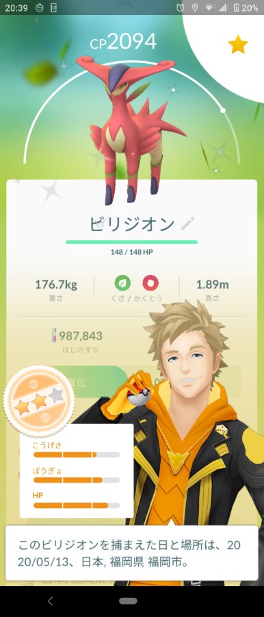 #ポケモンGO ビリジオン再登場11戦目で、色違い出ました✨ 狙うは、戦闘力2500迄用にふさわしい個体値です(色違いで)
