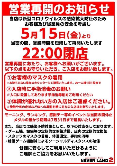 準ホームであるところのネバーランド座間店の営業再開のお知らせが発表されました!短縮営業でもとてもありがたいです!