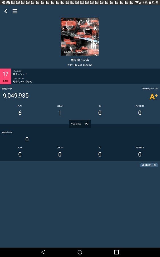 色を喪った街赤、クリア出来ました。解禁する時に5回も練習が出来たので、クリアは1回で出来ました。この解禁システムは何回も練習出来るのでクリアはしやすくなりそうな気がします、たぶん。これでレベル17のクリアが341曲になりました。