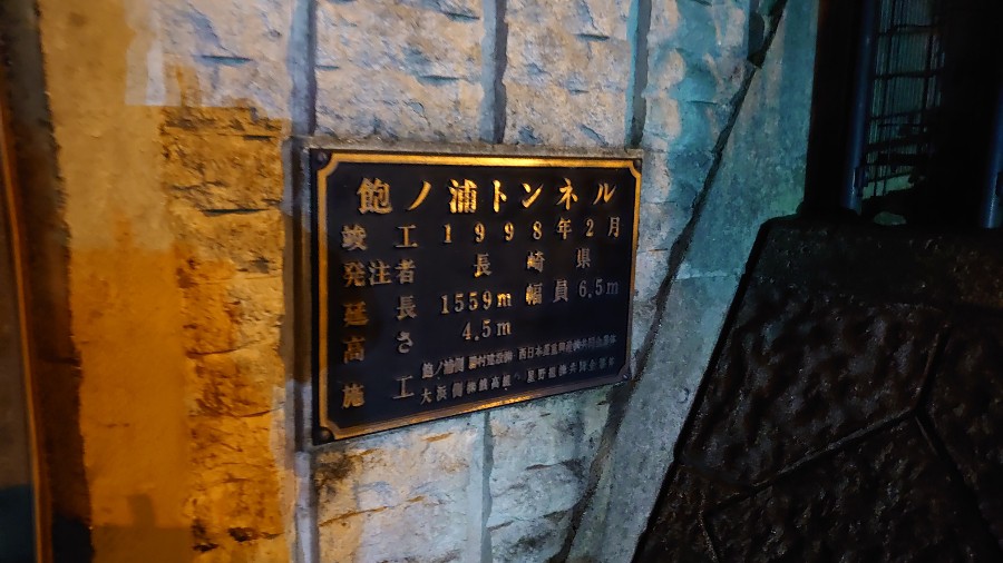 飽の浦(あくのうら)トンネルの銘板。 だいたい1kmぐらいだろうなと思ってたんですが、実は1559m………思ったより長かった°o°;