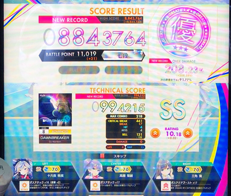 他社ですがオンゲキ上げます(・ω・)ノ ドーンブレイカー黄譜面初見SSクリアしました(`・ω・´) 今回追加された茜様の担当曲はどちらも素敵でした(*´꒳`*) #オンゲキ