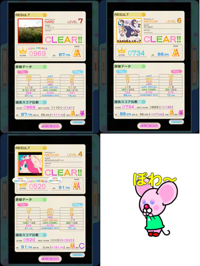 【母のリフレクplus】ARチャレンジは今回も4つ。 こちらも順調にこなしています♪ 残るは課題2だけですね。 2.「パンダヒーロー」赤9を80.0%以上→6回挑戦済み、自己記録78.6%から更新なし 3.「ソラニン」赤7を85.0%以上→1回で達成 4.「Shake!」黄6を85.0%以上→3回目で達成 5.「smooooch・∀・」黄4を90.0%以上→1回で達成