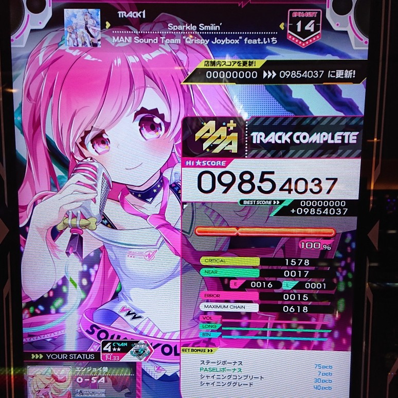 こんばんは~(・∀・) 昨日の車の件の後…いろいろ慣らしてからプレーしに行きました。そのリザルトを上げていきます。 昨日のボルテから、Sparkle Smilin'(EXH 14)ハードです。 全機種に出た新曲、まずボルテ側でやりました。