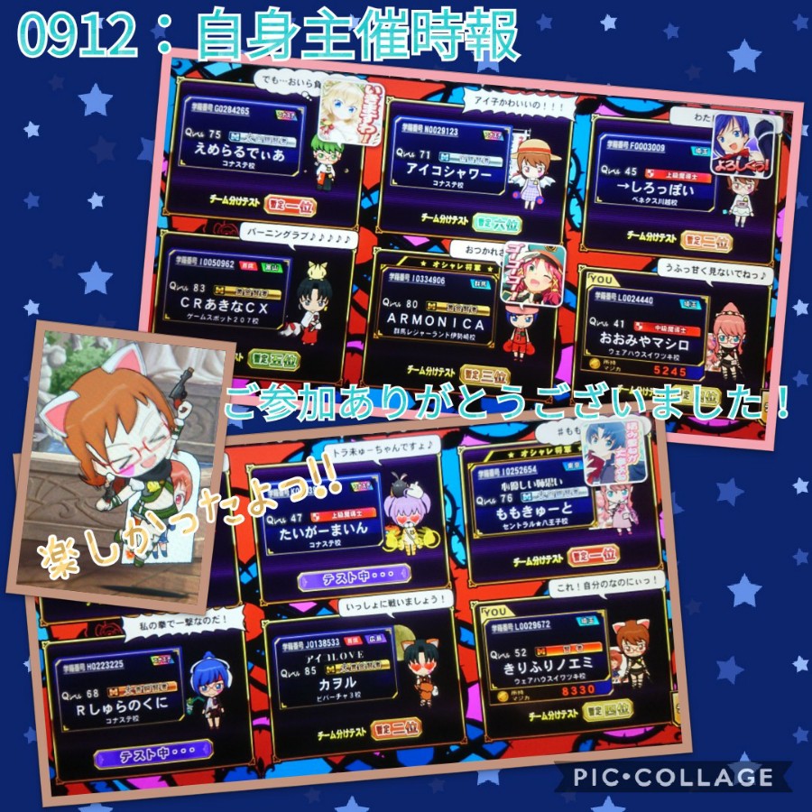 自分「ぬぉっ!? こんな時間(12:30)だとぉっ!?」 アイコ「おっそーいっ!! 待ちくたびれたよっ!!(*≧Д≦)ノ」 リエル「昨晩は夜遅い中、時報へのご参加ありがとうございましたぁ☆」 マヤ「告知のシェアをして頂いた方、ご同行頂きました方、 そしてご参加頂いた全ての方に最上級の謝辞を捧げます♪」 ミュー「とっても楽しかったのです♪」 アロエ「みんなでワイワイ遊べてよかったよぉ(*´▽`)ノ」 メディア「それじゃあ、一緒に遊んだ人を紹介するわねっ♡」 【 マッチした方々 】 ムゲン様(2)、ヒジリー様、2ASIN様、SKAL様、 ゆめのひみこ様、ARMONICA様(2)、いずな様、ロンメル様、 CRあきなCX様(3)、えめらるでぃあ様、アイコシャワー様(3)、 →しろっぽい様、ヒゲとボイン様、Rしゅらのくに様(2)、 カヲル様(2)、あきつしま様、たいがーまいん様、ももきゅーと様 アイコ「うはっ!すっごいマッチしてんじゃんっ!!(*≧▽≦)ノ」 マヤ「有り難いことね(*´▽`)」 ミュー「この時間帯…見覚えがあるのです」 自分「以前、温泉最高様がやってた時間帯だねぇ」 メディア「夜プレーが多い私達にはうってつけよねっ♪」 アロエ「ふぇぇ…お着替え間に合わないよぉ💦」 リエル「アロエさん通り名が…って、間に合いませんでした💦」 自分「トリニクは12分間隔が難しいようで… サブカ勢の皆様にはご苦労をお掛けしましたorz」 アイコ「熊が出たぞーっ!(*≧▽≦)ノ ってぇっ!?Σ( ̄□ ̄;)」 ミュー「むー…夜襲を掛けたのに皆さん起きてるのです💦」 自分「猛者の皆様には、奇襲くらいじゃあ通じないって事だねぇ」 メディア「一緒に寝ましょっ♡」(はぐぎゅー) アロミュ「むきゅぅぅ…💦」 マヤ「レンジャー衣装のまま寝る気かしら^-^;」 リエル「ちゃんとお風呂に入りましょうねぇ><」 自分「改めまして、ご参加頂きましてありがとうございました!!」 マヤ「勝ち負けの色が強いモードですけど、 こうやって皆さんで遊べば中々良いものですよね^-^」 メディア「バラエティ豊かでおもしろいわっ☆」 アロエ「虫食いクイズがすぐ分かるとうれしくなっちゃうよ♪」 ミュー「○×ポチポチ楽しいのです♪」 リエル「楽しみ方を工夫すると、見方が変わりますねぇ(*´▽`)」 アイコ「てなわけで今回ここまでっ! まったねーっ!!(*≧▽≦)ノ」 自分「次は、15:55発のトリニク線特急・誕生祝い号です!」