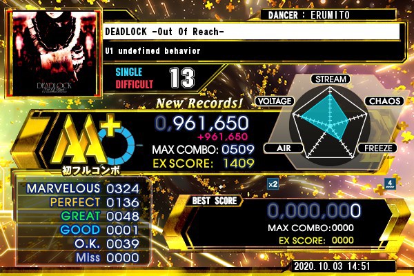 今日の新規足13フルコン、DEADLOCK -Out Of Reach-踊。ラストの単純ながら延々と捻る8分滝が実に楽しい(半分はスライドで処理)。フルコン狙いだとラストの12分が怖い。