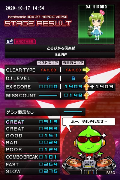 SP☆11 とろぴかる倶楽部(A) アリーナでの他選曲。 こちらも前半はゲージがずっとボーダーを越えてましたが、16分連皿から崩れていきましたorz 8分皿は前より取れてるのかな? 前作のC判定よりはスコアが伸びました(^_^)ゞ