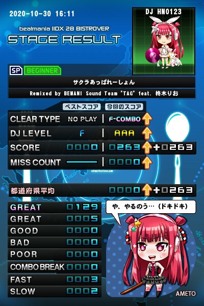 10月30日(金) FC SPB☆1 サクラあっぱれーしょん SP奈々級(七級)の1曲目! MAX-5とスコア勢じゃない自分には良いスコアが出せました☆