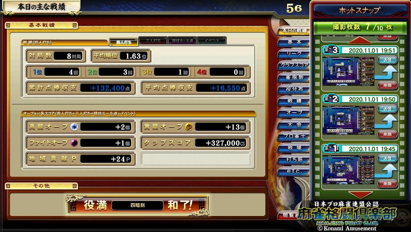 11月になりました。 先月は出遅れ発生で涙目でしたが、 今月はいいスタートダッシュ出来ました。 四暗刻も出来たので文句なし。 リーグも最下位から最上位にアップ。 この感覚を維持したい。