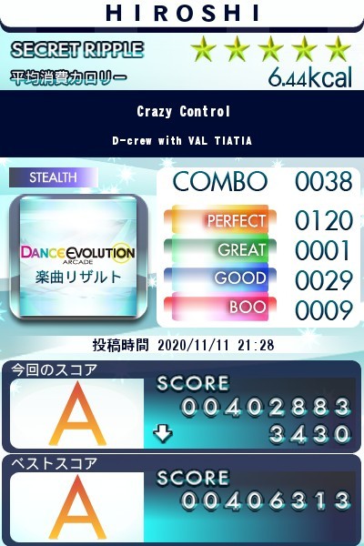 DDRのあと、ダンエボやりました CrazyControlSTEALTH 1回目、ステップうまくいかず この後の2回目は振り付け左右逆やったりしてもっと悪くなりました (ノ´Д`)ノ