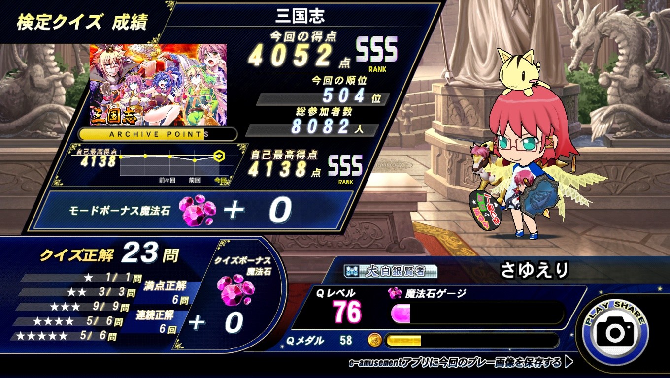 今日は検定からプレー。選んだのは三国志検定。SSSランクを 記録。ヴァニィのうちわをゲットしました。