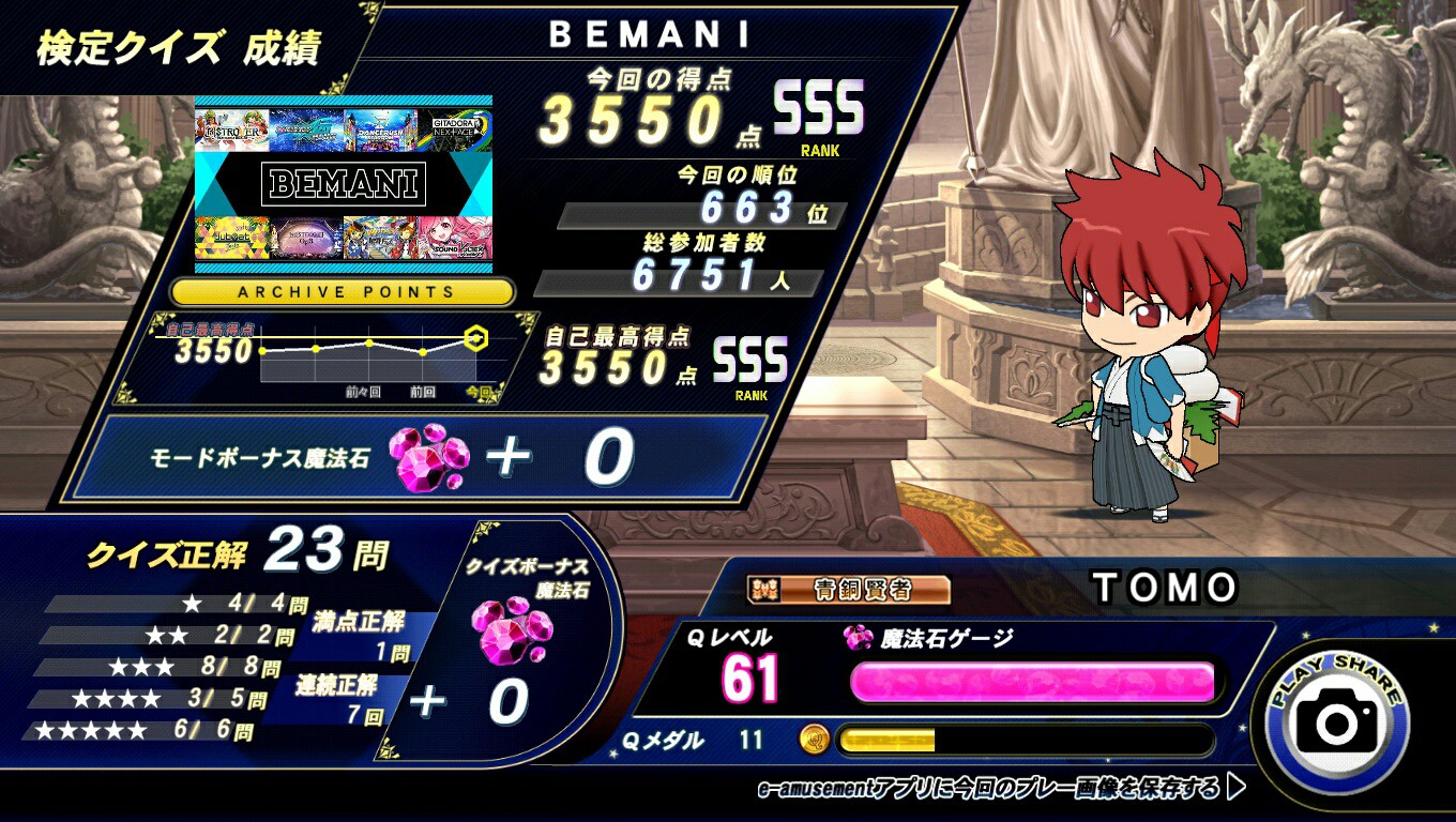 BEMANI検定。 Oh~、SSSランクに到達出来ました(*・ω・人☆ REFLECの「瀦」の読み方問題もありましたね。 ちなみにスコア更新になった時の問題は、、 ギタドラの「Keiko my love」で登場する力士の名前は? ちゃんこ「山崎」 を答えてグーンと伸びました(´ε` )ドスコーイ*