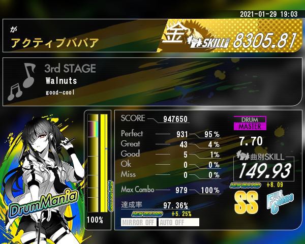 ドラムマニアがやりたくなったので珍しく平日仕事帰りにゲーセン!…メガネ忘れたーーー😭!!降ってくるノーツが全部ぼやけて縦分身状態になっててパフェ率なんて狙えんかったのでコンボを繋ぎにかかったらこの曲初フルコンした(笑)