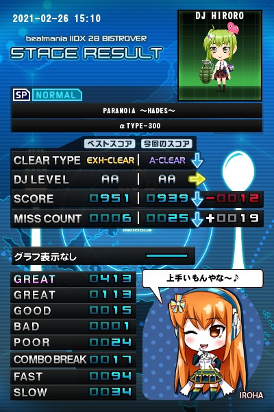 SP☆7 PARANOiA ~HADES~(N)・S乱 アリーナでの自選曲。 B5に上がった直後のプレイで、B5九段さんとマッチング出来ました(・∀・) この曲、もしかしたら刺さるのかも? この曲だけ1位で、あとの曲は2位でした(^_^)ゞ