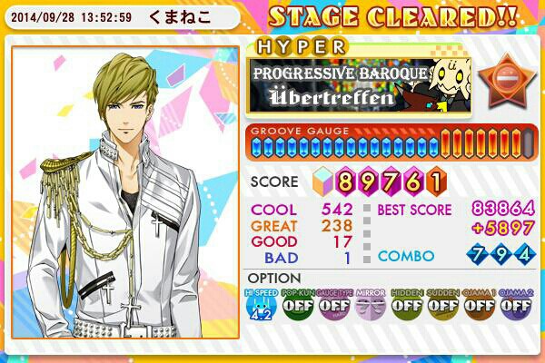 フィーバー2曲目はバーローことプログレッシブバロックです。 実は初めてプレイした時、Hができなかった曲でもあります。何回か後、鏡付けたらクリア出来ましたが…(>_<) せっかくフルコン間近だったのに、最後の最後て自爆してbat1とか泣きたい\(^o^)/