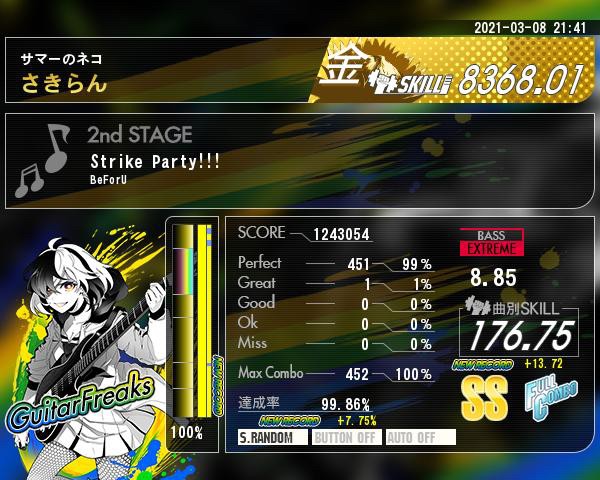 Strike Party!!! 赤B フルコンボ!!! いつも緊張に弱くて1切りするのに珍しく綺麗に決まった!! 旧曲1位!!