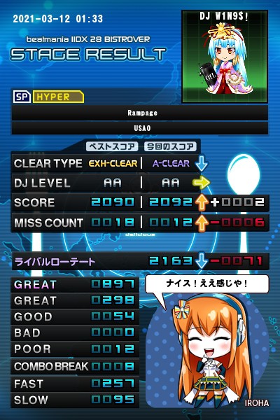 ☆10 Rampage(H) 2点伸びた(^ω^) ターゲットライバル様に中盤まで 勝ってたと思ったのに終盤でひっくり返された ようです(;><) 焦ってfastになってしまったんだろうね。 次こそは(; ・`ω・´)