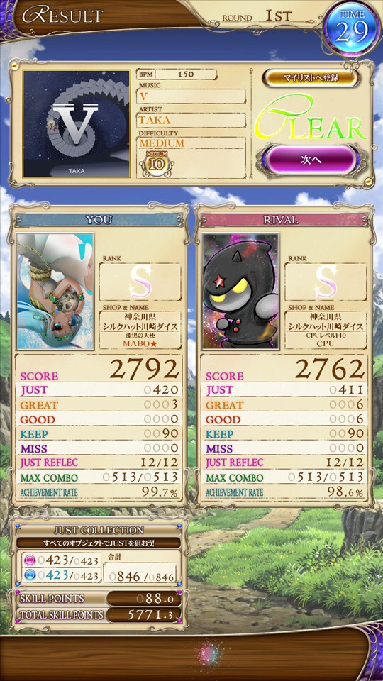 V MEDIUM☆ jubeatの今日のおすすめ曲は「V」でした。 Windy[2]かと思ったのにー笑 再エクセならずも誕生日リフレクは楽しい!