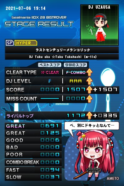 (IIDX)ラストセンチュリーメランコリック(SPH)をフルコン。配置は鏡。