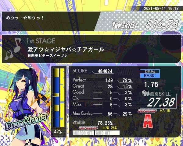 1日遅れですが。 いぶぶ誕生日おめでとう。 もちろん、ドラムマニアでもプレーしました。 ひなビタにはまったキッカケて実はこの曲なんです。 とびふわなんですよとか言っときながらなんですけどね。 ずいぶん前になりますが、この曲のデモ画面のジャケットのイラストのチアガールのいぶぶがあまりにも可愛かったので、 ドラムマニアに吸い込まれました(笑) まだ、この曲がギタドラに入ったばかりの頃だったと思います この曲を初プレー時にはポップンに入ってなかったし。