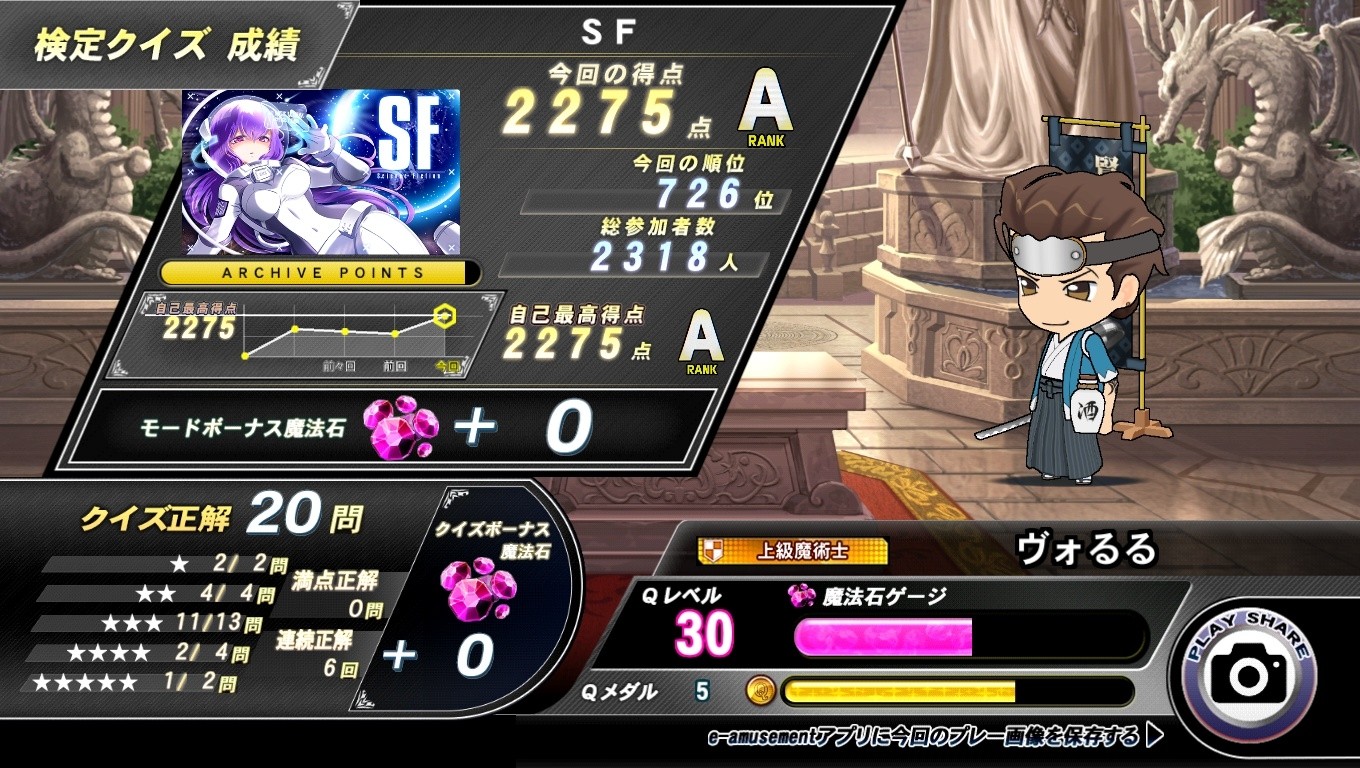 昨日の話しになっちゃったけど、マジアカでSF検定をAランクにできた🎵 もう少しでSにいけるかもしれない… #QMA #検定試験