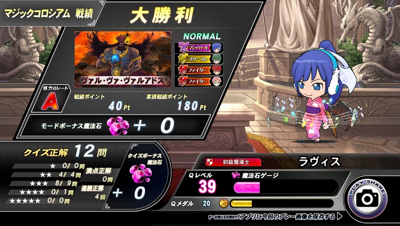 #QMA これは今日のマジックコロシアム。 今回はマジックナイトを選んだ。 ミッションの為でもあるけど…。 クリティカルを喰らったからもうダメかと思ったけど…。 なんとかトドメをさせて大勝利した。 マジックナイトの捨て身攻撃はうまく使いこなすのが大事だね。