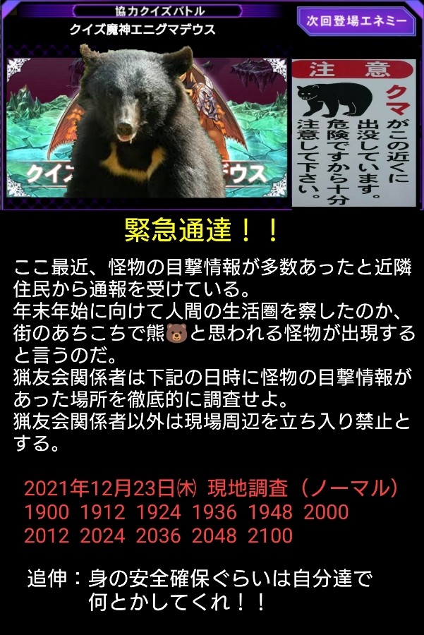 #熊出没注意 今度の奴は、年末年始における人間の流れを学習した可能性が高いのである。 本格的な年末年始ではないうちに出没するとは。 今回の奴の出没自体がプロトタイプか?🧐🤔