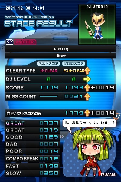 イチオシのライキ。 行脚中だったのであっさり終わらせようとEXHゲージで選んだのに どういうことだか完走してしまったという 自分としては非常に貴重な光景です。 なんでできたかわかりませんが スコアはヴァイ✕4で落ちた時と変わらないですので もう一度やり直した方がいいとは思います。