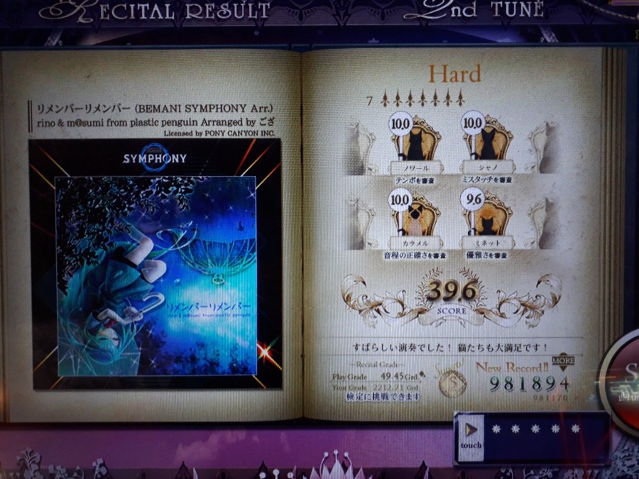 これで“BEMANI楽曲、難易度7以上で【RECITAL】37Grd以上を3回達成”のお題を達成できた(やったぞ!)。“あ〜あ〜”の部分を強く弾かせたりetcレイニーワルツシンフォニーのリサイタルは強弱の指示がとってもとっても曲に合っていて最高でした!(楽しい)