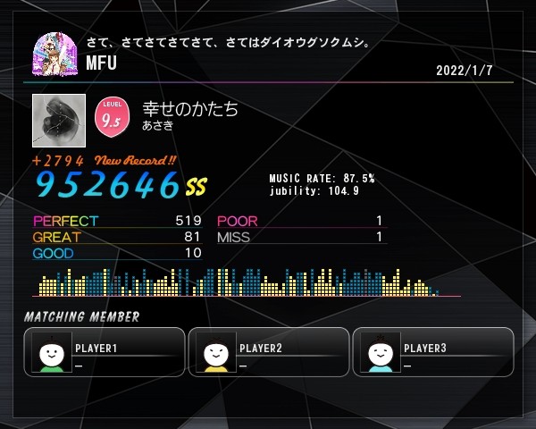 幸せのかたち赤、少し伸びてSSクリアに出来ました。前より花押しが取れたので伸びました。この曲なかなか伸びなかったです。