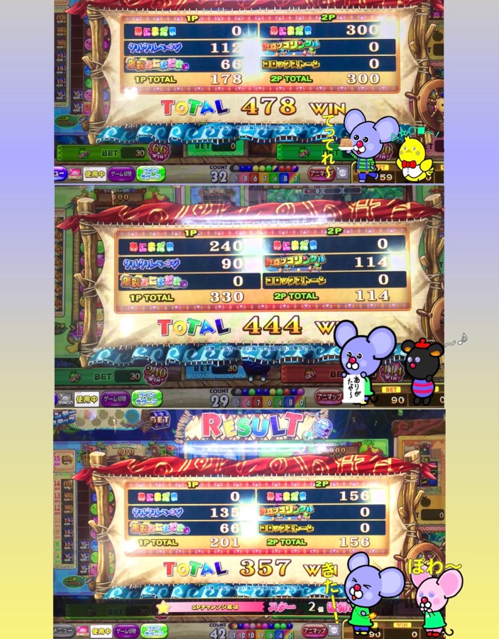 土曜日のカラコロッタです。 いつもは1ゲーム15BETですが、ミリオンランカーの誕生日ボーナスがかかっていたため今回は倍の30BETでやってみました♪ この選択が良かったのか、1ゲームが長続きすることが多く、あにまだまで高配当がガンガン飛び出しました(笑)。 めっちゃ楽しめましたね〜♪ さらにはSPチャレンジの自分の発射番でうまくSPポケットに入り、2つのステーションからSUNSUNボーナスが出るなど、周りのプレーヤーにも貢献できたようです♪ 結果700枚ほどのプラスで、FT4で負けた分を上回りましたね♪